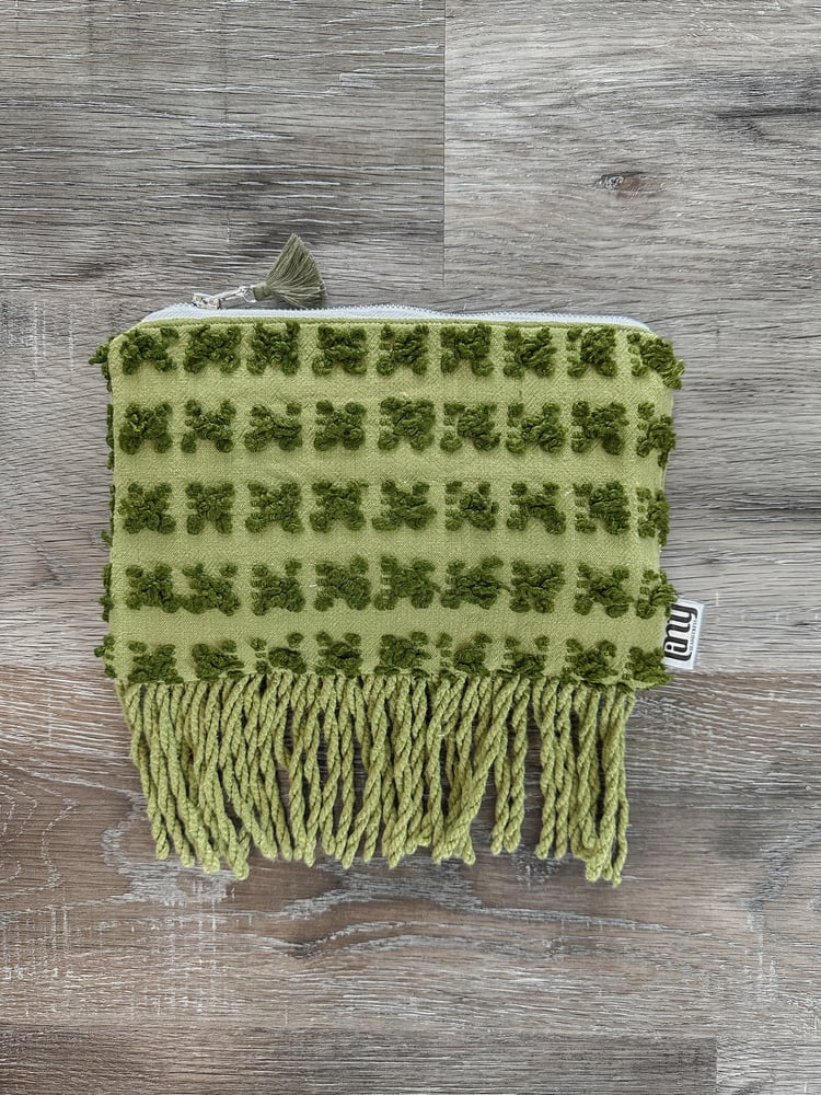 Measuring approx a 10” x 6”. Hand crafted with a sturdy zipper and mini tassel.